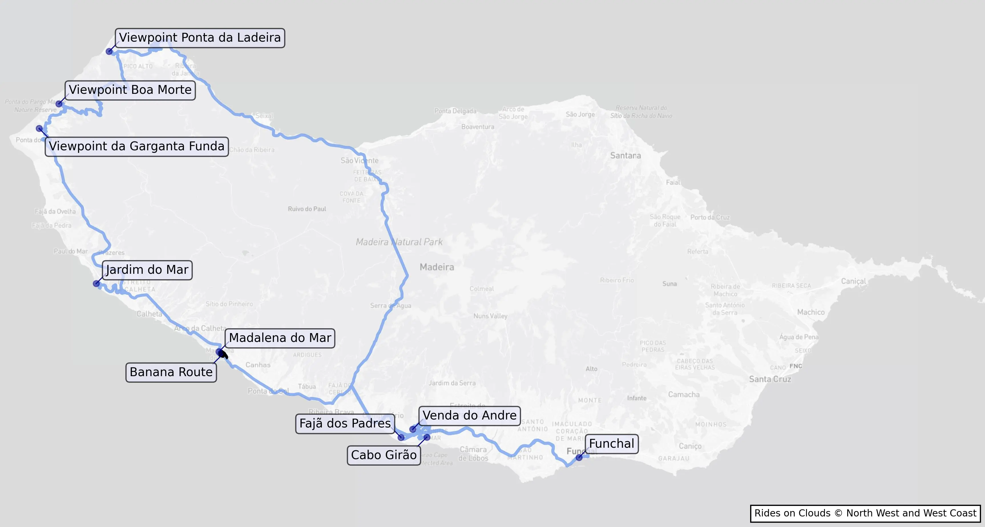 Back home North West and West Coast Book one day REQUEST A QUOTE BOOKING ONLINE OFFERS Best price guarantee Secure payment Flexible cancellation Itinerary & Hikes What to bring? Weather Restaurants 9 Places 8 hours Near Porto Moniz, where Madeira's north meets west, there's a spot that feels like nature's private viewing deck, particularly known for its stunning sunsets. Find Miradouro Ponta da Ladeira on Google Maps, park and follow your sense of adventure down a short dirt track. Let's be honest - it's not fancy, but that's what makes it so special: fewer tourists, no selfie-snapping crowds. While the rest of Madeira plays peek-a-boo with clouds, this north-western corner often stays surprisingly clear. Itinerary & Hikes On Madeira 's west coast, between Ponta do Pargo and Paul do Mar, lies Garganta Funda waterfall. This 140-meter waterfall drops straight down the cliff into the Atlantic ocean. Where land surrenders to sea, at Madeira's westernmost point, stands the Ponta do Pargo lighthouse. At 290 meters above the Atlantic and visible from 50 meters this 1922 lighthouse is one the highest lighthouses of the world and the highest of Portugal. Heading towards the south-west coast of the island, your next stop will be Jardim do Mar or 'Garden of the Sea', a small and secluded village of around 300 inhabitants. It is full of life and colour, with wild flowers covering the hills and narrow cobbled streets with charming little houses and gardens. The village is car free, making it an ideal destination for those wanting to take a peaceful stroll while admiring the breathtaking views and exploring the local shops, cafes and traditional houses in a tranquil atmosphere. The bay is popular with surfers due to the larger waves that roll in from the Atlantic, especially when compared to the southern beaches of the island. The numerous waves that break on the pebble beach make it an excellent wave spot, one of the best in Europe. Please note that this also makes it quite dangerous to go swimming in the water. When you're ready, we'll make our way back, leaving you plenty of time to ask questions, take photos and make the most of this private experience. Madalena do Mar is a picturesque village on the southwest coast of Madeira, renowned for its tranquil atmosphere and mild, sunny climate, ideal for banana growing. Explore Madeira's enchanting Banana Route - a vibrant journey through lush, terraced banana plantations that plunge into the Atlantic Ocean. It takes you along concrete paths, small levadas and a few steps through banana plantations where you can often see locals at work. If you're looking for a real Madeiran tasca (local tavern) experience, A venda do Andre is where the locals gather in Campanário. Off the beaten track, this simple place is known for its home-style cooking and authentic atmosphere. This unassuming place is popular with the locals and offers a real slice of village life. It's an authentic example of the old traditional tasca - the term refers to a small, informal tavern or pub. Tucked away beneath Madeira's towering southern cliffs lies a hidden slice of paradise - Fajã dos Padres is only accessible by cable car (250m drop). The cable car descent is an experience in itself - watching the cliff face glide past while fishing boats dot the Atlantic below. This fajã (flat land at the base of the cliff) is a story of human determination meeting the power of nature - where volcanic soil and a unique microclimate create the perfect conditions for rare crops. You 'll be able to walk in the garden among avocados, bananas and mangoes and also enjoy the beachfront restaurant which is very good. Between the organic gardens and the Atlantic, a quiet black pebble beach stretches along the coast, perfect for a dip in the crystal clear waters. The restaurant's menu changes depending on what's grown on the organic farm above. You'll need to book in advance, especially for lunch, and the cable car ticket (€12) is separate from the cost of the restaurant. Best to call them directly to check times and availability. Your last stop for the day is the Cabo Girão Sky-walk, the second highest cliff in Europe. Opened in 2012, many say it is similar to the one in America's Grand Canyon. Both are made of transparent glass and offer breathtaking views. BOOK now 01 Viewpoint Ponta da Ladeira 02 Viewpoint Boa Morte 03 Viewpoint da Garganta Funda Impressive waterfall especially in the winter time when the debit is higher 04 Jardim do Mar An idyllic and charming fishermen village 05 Madalena do Mar & Banna Route A vibrant journey through lush, terraced banana plantations that plunge into the Atlantic. It leads along concrete paths, small levadas and a few stairs through banana plantations where you can often see locals at work. 06 Venda do Andre Afternoon snack 07 Paul do Mar 08 Fajã dos Padres 09 Cabo Girão The highest sky-walk on a cliff in Europe Your must-have packing list A lightweight rain jacket: Madeira's microclimates can change from sunny to rainy in an instant. It's much better to have a raincoat and not need it than to get soaked and wish you had! Head torch: Perfect for those levada tunnels where your phone's flashlight just won't do. Also a lifesaver if you're hiking at sunrise or sunset. Sunscreen essentials: Don't forget your sunscreen, hat and sunglasses. Even when it's cloudy, Madeira's UV can be sneaky, especially in the summer due to its proximity to Ecuador. Water and snacks: Stay hydrated with plenty of water and your favourite trail snacks. Comfortable walking shoes. Also, bring a plastic bag to pick up any litter you may find along the way. It's a small gesture that gives back to this beautiful place and helps keep the trail unspoiled. Think of it as a way of saying thank you to the great outdoors for all the amazing scenery it shares with us. Weather To stay one step ahead, take advantage of the network of webcams scattered across Madeira. These handy cams give you a rea